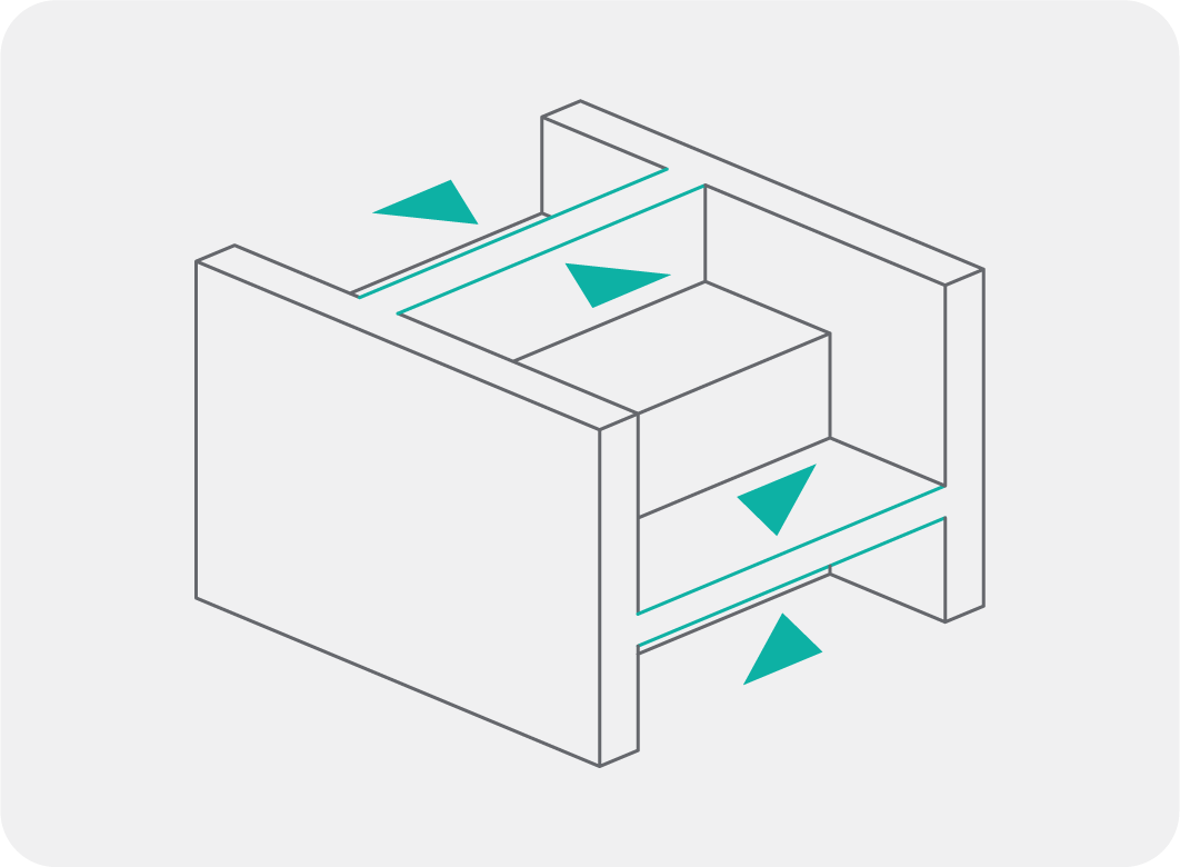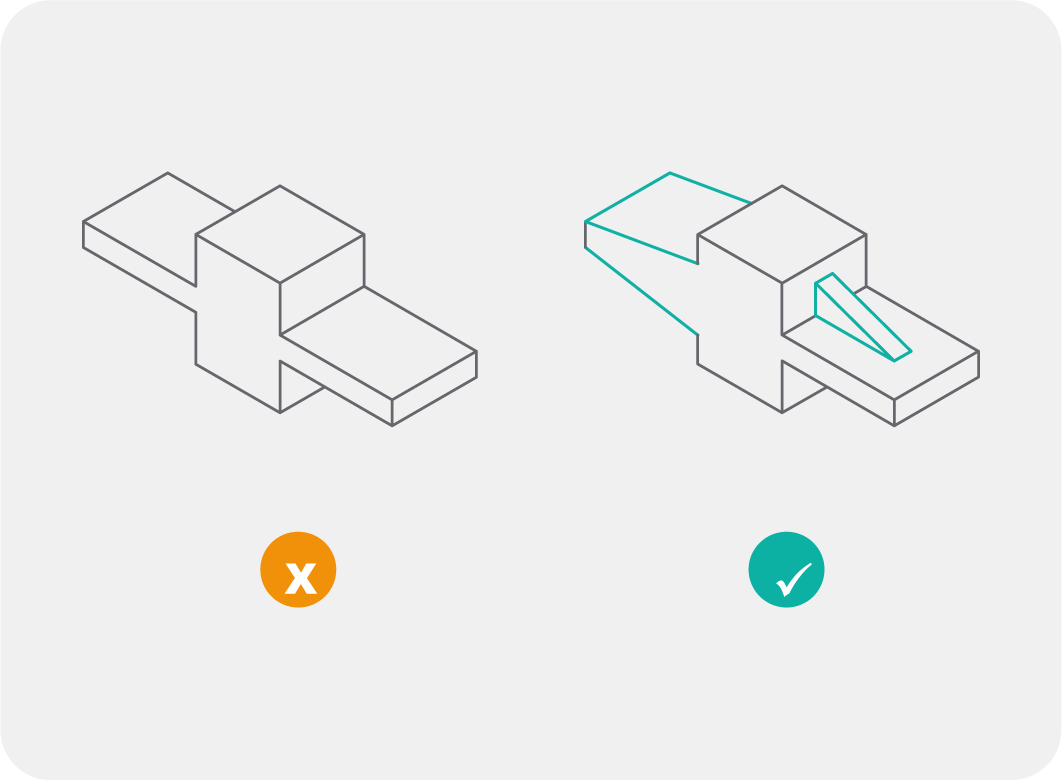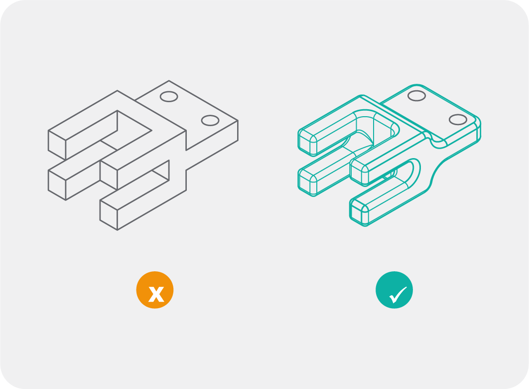 I pezzi possono subire un accumulo di sollecitazioni in corrispondenza di brusche variazioni della sezione trasversale, come nel caso di estrusioni sottili da basi spesse. Per ridurre queste concentrazioni di sollecitazioni, è necessario progettare transizioni graduali dei bordi anziché brusche.
